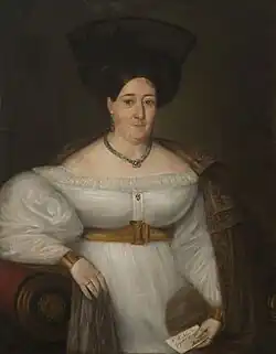 The trend was unique to the Río de la Plata, serving as a way to differentiate from Spanish culture and becoming a defining feature of porteño women for both locals and foreigners.[8][9] As such, it represents a moment of interest for Argentine fashion historians, and is associated with a growing sense of national identity in post-colonial Argentina, which had declared independence in 1816 and was undergoing a series of bloody civil wars between Federalists and Unitarians.[2][1] The development of the fashion mainly took place during the rule of the Federalist Juan Manuel de Rosas, a time in which clothing became increasingly codified to demonstrate political adherence to the regime.[2] In fact, the use of the peinetón was eventually associated with Federalist women, with models often featuring effigies of Rosas and political slogans of the party.[3][10][8]