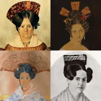 The peinetón (plural: peinetones) is a large, decorative comb that originated in Buenos Aires, Argentina and became very fashionable among its female inhabitants as well as those of Montevideo, Uruguay between the late 1820s and the mid to late 1830s.[1][2] Although its origin can be traced back to the traditional Spanish peineta, the peinetón derived into a different headpiece altogether, both for its physical characteristics as well as for the symbolic meanings around its use.[3][2] The peineta was introduced to Buenos Aires around 1815 and, as early as 1824, interest began to grow in larger and more elaborate models, eventually giving rise to the peinetón that had its heyday between 1830 and 1837.[2] The accessory emerged during the Romantic era[note 1] of Western fashion, and was worn alongside dresses with small waists and large, voluminous sleeves.[4]