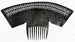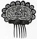 The peinetón is a one-piece headdress with a slightly convex body, with both sides fretworked and profusely decorated.[3] It is made up of two well-differentiated parts: the comb, which fulfills the functional role of securing the peinetón to the hair, and the field, the visible area that features the ornamentation.[3] According to fashion historian Regina A. Root, peinetones "could have from six to fourteen teeth and weigh 1.65 pounds (750 grams)".[1] They were typically made out of tortoiseshell, although the cheaper bull's horn was also used,[7] particularly when the former was in short supply.[3] Ivory, nacre and silver were also used to a lesser extent.[3] In the General Archive of the Nation there are numerous inventories of pulperías where peinetones made of talco (lit. 'talc') are also mentioned.[4] There are no known references as to the material they are referring to, although it may have been some kind of plaster.[4]