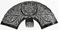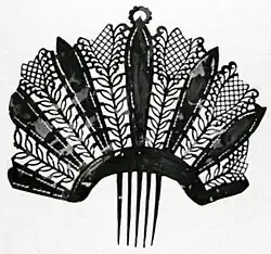 Peinetones were defined by their extravagant size, measuring up to 120 centimetres (3 feet 11 inches) in height and width at the height of their popularity.[5][6] They were typically made out of tortoiseshell, although the cheaper horn was also common,[7] particularly when the former was in short supply.[3] The tortoiseshell was imported as pieces or plates, which were cut, heat-fused, fretworked, chiseled and polished by craftsmen in the city's workshops, sometimes also being printed and inlaid.[8][1] The design of each peinetón was unique and tailored to the tastes of each woman.[2] The one-piece accessory had a slightly convex body, it came in a variety of different shapes and featured profuse ornamentation with designs inspired by nature and Neoclassicism.[3][4]