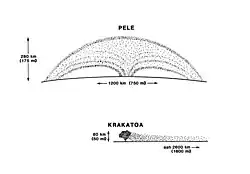 Pele's plume is the archetypal Pele-type plume: 300 km (190 mi) tall, producing a large reddish deposit that is concentric around the source vent. The plume is created from the degassing of sulfur (S2) and sulfur dioxide (SO2) from erupting lava in the Pele lava lake.[13][14] The persistence of degassed sulfurous compounds to Pele's plume is likely from a stable and consistent magma supply to its lava lake,[14] which could be the largest magma chamber of Io's volcanoes.[16] Images of the plume taken by Voyager 1 revealed a large structure without a central column like the smaller, Prometheus-type plumes, but instead having a filamentary structure.[17] This morphology is consistent with a plume that is formed by sulfurous gases erupted skyward from the Pele lava lake, which then condense into solid S2 and SO2 when they reach the shock canopy along the outer edge of the umbrella-shaped plume.[2] These condensed materials then are deposited onto the surface, forming a large, red, oval-shaped ring around the Pele volcano.[13] The oval shape of the deposits, elongated in roughly the north-south direction, may be the result of an east-west, linear source region, consistent with the shape and orientation of the graben that forms the southern and more active portion of the Pele patera.[18] Variable activity in different portions of the Pele lava lake may also result in the changes in brightness and shape of the plume deposit over time observed by various spacecraft.[18][19]