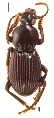 Adults reach a length of about 10 mm. They have an elongate, flat body. The head, pronotum and elytra are dark reddish brown.