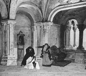 Maeterlinck claimed that he only learned of Garden's casting when it was announced in the press at the end of December 1901.[25] He was furious and took legal action to prevent the opera from going ahead. When this failed—as it was bound to do, since he had given Debussy his written authorisation to stage the opera as he saw fit in 1895[26]—he told Leblanc that he was going to give Debussy "a few whacks to teach him some manners." He went to Debussy's home, where he threatened the composer. Madame Debussy intervened; the composer calmly remained seated.[27] On 13 April 1902, about two weeks before the premiere, Le Figaro published a letter from Maeterlinck in which he dissociated himself the opera as "a work that is strange and hostile to me [...] I can only wish for its immediate and decided failure."[28] Maeterlinck finally saw the opera in 1920, two years after Debussy's death. He later confessed: "In this affair I was entirely wrong and he was a thousand times right."[29]
