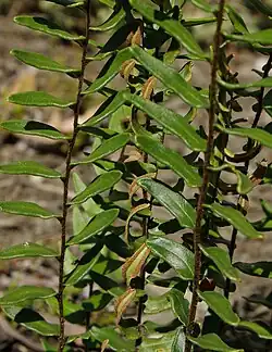 The fronds may be up to 50 cm long. They are sexually dimorphic with shorter sterile fronds with up to 12 pinnae. The stipe can occupy nearly half the length of the frond. Reddish brown scales and hairs cover both the stipe and rachis. The spore bearing rachis may have up to 40 pinnae each borne on a short stalk. The leaves are glossy green with characteristic in-rolled sori as a band around the paler green underside of each pinna. The terminal pinnae is sometimes greatly enlarged.[2]