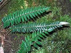 The fronds are usually 20 to 50 cm long. Each frond has between 25 and 65 pinnae (leaflets), which have a short stalk or no stalk, and are oblong to narrow-oblong in shape. Each pinna is 25 mm long and 2.5 to 7 cm wide. The fronds are dark green, paler below. The sori are about 1 mm wide.