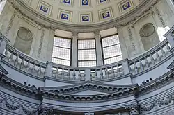 The first order is surmounted by a balcony with parapet, at the height of which begins the second, larger-diameter level, also of Corinthian order, which serves as the drum on which the dome is set; it is distinguished by the presence of four aediculae and four large tripartite windows with coupled columns that are located at the tabernacles of the lower level.[18][22] A peculiarity, compared to the first order, is that only the columns and entablature are made of stone, while the rest is in lime plaster and marble dust, although the resulting surface has been bush-hammered and scraped as if it had been stone.[18]