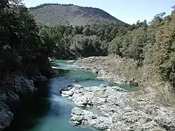 The Pelorus River was originally known as Te Hoeire by local Māori after the first canoe to travel to the South Island. The river flows east until it enters Pelorus Sound at Havelock. The valley was the site of a massacre of Ngāti Kuia and Ngāti Apa ki te Rā Tō by Te Rauparaha. European exploration and exploitation was begun by Lieutenant Chetwode of HMS Pelorus in 1838, who named both the river and the sound after his vessel.[3] Brownlee Tramway transported timber from the Carluke Sawmill through the river valley to the shipping port and mill of Blackball, Havelock, from c.1881 through to 1915.[4]