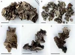 | Various images of Peltigera alkalicola; scales: A, C–E = 0.5 cm; B = 1 cm | |