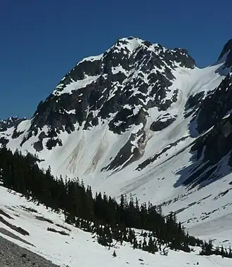Pelton Peak is a 7,133-foot (2,174-metre) mountain summit located in Chelan County of Washington state.[1] It is part of the North Cascades, a subset of the Cascade Range. Pelton Peak is situated 1.8 miles (2.9 km) southeast of Cascade Pass in North Cascades National Park near the northern end of the Ptarmigan Traverse. The nearest higher peak is Magic Mountain, 0.4 miles (0.64 km) to the southwest.[2] The Yawning Glacier rests on its western flank between these two peaks. Surface runoff from the mountain drains into tributaries of the Stehekin River. The mountain's name comes from the Pelton wheel which was used in early mining times, and several mines were located in the vicinity of Pelton Basin, Horseshoe Basin, and Boston Basin.[3]