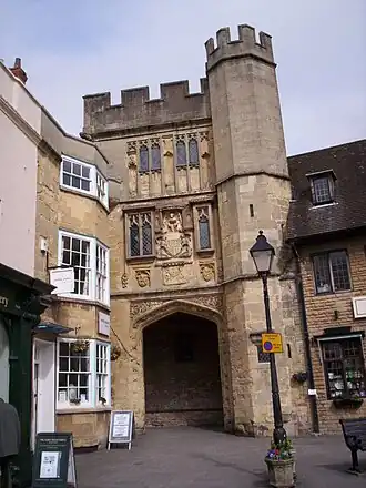 It is a three-storey building of Doulting ashlar stone.[1] The roof is behind a battlemented parapet.[2] It is connected to the adjacent buildings and the rooms above the archway are used by the company occupying No 16 Market Place.[4] The first floor room has panelling from the 17th century.[2]