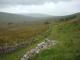 The route begins (and ends) in Settle, North Yorkshire, heading north along the eastern edge of the Pennines, over Penyghent where the trail meets the Pennine Way.[2] The path continues past Askrigg to Tan Hill (where it enters the North Pennines AONB), Bowes and Tees High Force to Hexham.[3] After Hexham it turns westwards along 21 miles (34 km) of Hadrian's Wall, before heading south at Greenhead to Alston, Appleby, Kirkby Stephen, and Garsdale.[4] It then turns westwards through Grisedale and across the northern edge of Baugh Fell to Sedbergh, before heading south over Whernside and Ingleborough (with a dog-leg to Ingleton), and returning to Settle.[5][6][7] The walk is divided into eighteen stages, with some short lengths of just over 7.25 miles (11.67 km) (Settle to Horton-in-Ribblesdale), and the longest being just shy of 18 miles (29 km) (Sedbergh to Ingleton).[8]