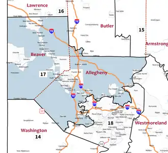 In January 2018, the Supreme Court of Pennsylvania ruled that the 2011 map violated the state constitution and redrew it on February 18, 2018. What was the 17th district, which had been anchored in Northeast Pennsylvania, was modified to become the 9th district, and the old 12th district likewise became the 17th, for the 2018 elections and representation thereafter until the current map was ordered on February 23, 2022.[3][4][5] In the 2020 redistricting cycle, its portion of Butler County, including Cranberry Township, was removed from the district, while it gained some eastern suburbs of Pittsburgh, such as Forest Hills and Wilkinsburg.