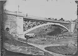 At its construction, it was the only bridge made entirely of cast iron of substantial size in the United States. It was initially intended to be solely an aqueduct bridge carrying water mains connected to the Georgetown Reservoir, but the onset of the Civil War necessitated making it a vehicular crossing as well.[1] The level of traffic was such that the wooden deck had to be replaced every three years.[2]