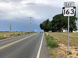 PA 163 begins at the Maryland state line in Antrim Township. The roadway continues south as MD 63 (Greencastle Pike) toward Cearfoss and the town of Williamsport. PA 163 begins heading north from the state line on two-lane undivided Williamsport Pike, then immediately turns east onto Mason Dixon Road. Williamsport Pike continues north as SR 3001, an unsigned quadrant route, toward the borough of Greencastle. PA 163 parallels the north side of the Maryland–Pennsylvania state line at a distance of about 200 feet (61 m) at Williamsport Pike. The distance reduces to less than 50 feet (15 m) after the state highway crosses Norfolk Southern Railway's Lurgan Branch at-grade. PA 163 continues east through farmland, intersecting Maugansville Road on the Maryland side before reaching its interchange with I-81 (American Legion Memorial Highway). The ramps to and from southbound I-81 are on the Maryland side of the highway, while the ramps to and from northbound I-81 are in Pennsylvania. PA 163 continues east into the unincorporated village of State Line where the highway reaches its eastern terminus at US 11 (Molly Pitcher Highway) just north of where US 11 enters Maryland.[1][2][3]
