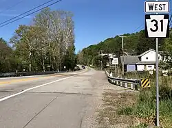 Entering Bedford County, there are no major intersections with any numbered roads until PA 31 enters Manns Choice. Instead, it winds through hilly terrain that parallels the Turnpike.[18] As PA 31 nears Manns Choice, it intersects Pennsylvania Route 96 and is concurrent for 1.81 mi (2.91 km).[19] After separating, PA 31 continues for 3.44 mi (5.54 km) before terminating at U.S. Route 30.[20]
