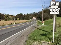 PA 333 heads through a mix of farmland and woodland before coming into the borough of Thompsontown and passing homes on Mill Street. The route turns east onto East Main Street and runs through residential and business areas. PA 333 turns north onto an unnamed four-lane divided highway and reaches an interchange with the U.S. Route 22 (US 22)/US 322 freeway. At this point, the route crosses back into Delaware Township and becomes a two-lane undivided road again, winding north through forested areas. PA 333 runs north through farmland with some woods and homes before ending at PA 235 in East Salem, with the road continuing north as part of PA 235.[2][3]