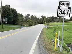 The route continues northwest through more woodland with some residences, entering Scott Township. PA 347 becomes Justus Boulevard and heads through rural residential areas, passing through Justus. The road heads north through a mix of farmland and woodland with some homes, running through the community of Millars School. The route intersects PA 632 and continues north through more rural areas a short distance to the east of I-81. PA 347 comes to its northern terminus at an intersection with PA 524, where the road continues north as part of that route.[2][3]