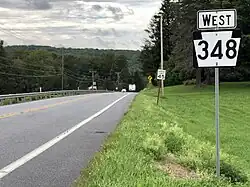 When Pennsylvania first legislated routes in 1911, the current alignment of PA 348 was not given a number.[5] By 1930, the road remained unnumbered and was paved in Lackawanna County and unpaved in Wayne County.[6] PA 348 was designated in the 1930s to run from US 611 (now PA 435) north of Elmhurst east to PA 590 north of Hollisterville. At this time, the entire length of the route was paved.[7] In 1958, the western terminus at US 611 was modified to its current configuration, with an overpass carrying northbound US 611 over PA 348 and a ramp from PA 348 to northbound US 611, as part of widening that section of US 611 into a divided highway.[8][9]