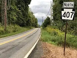 PA 407 follows the alignment of the Philadelphia and Great Bend Turnpike, a turnpike that was built in 1826.[5] This turnpike was chartered in 1811 and ran between Philadelphia and Great Bend. The Philadelphia and Great Bend Turnpike was built to attract settlers to rural Pennsylvania.[6] When Pennsylvania first legislated routes in 1911, what is now PA 407 was not given a number.[7] In 1928, PA 407 was designated to run from US 6/US 11 in Clarks Summit north to PA 107 in Fleetville. At this time, the entire length of road was paved.[8]