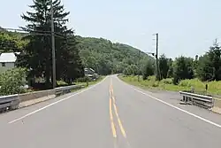 PA 42 enters Jordan Township in Lycoming County and continues through more agricultural and wooded areas with some residences. The road heads into more forested areas with a few homes and passes west of the community of Unityville, turning northwest and intersecting PA 118. The route curves back to the north and runs through more woodland with some farm fields and homes. PA 42 continues through agricultural areas and heads into Franklin Township, turning to the northwest and passing through more farmland and woodland with a few residences. The road heads through woods as it comes to a junction with the northern terminus of PA 239. The route continues west-northwest through more farms and woods with homes, passing through North Mountain. The road turns more to the northwest and briefly passes through a corner of Penn Township.[2][4]