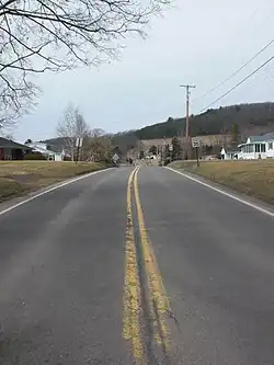 PA 44 runs through hilly areas with a mix of fields and woods, crossing into Hebron Township. The road winds north through rural areas, passing east of Greenman Hill. The route turns northwest and passes through the community of Hebron Center, continuing through wooded areas with some farm fields and residences. PA 44 reaches an intersection with the western terminus of PA 244 in the community of Coneville and turns to the west, heading to the south of Oswayo Creek. The road continues through rural areas alongside the creek and passes through the northeast corner of Clara Township before it enters Sharon Township. The route crosses the Oswayo Creek and heads through the community of Millport as it runs through more fields and woods with some development, passing through Sharon Center. PA 44 continues northwest and enters the borough of Shinglehouse, where the name becomes South Stevens Street and it runs through residential areas with some businesses, passing to the northeast of Oswayo Valley High School. The route curves north before it turns west onto Academy Street, heading past homes before passing businesses in the center of Shinglehouse and bending southwest. PA 44 heads into residential areas, turning northwest onto Oswayo Street and west-southwest onto Ceres Street. The road crosses Oswayo Creek and makes a curve to the northwest.[4][10] The route enters Ceres Township in McKean County and becomes Ceres Road, heading northwest through fields and development before running through wooded areas, with the creek to the northeast. The road continues through a mix of farm fields and wooded areas with some development, passing through the community of Myrtle. Farther northwest, PA 44 reaches the community of Ceres and crosses the Oswayo Creek before coming to its northern terminus at the New York border. From here, the road continues north for less than 100 yards (91 m) to a T-intersection with NY 417.[4][12]