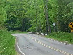 Continuing northward, the highway enters the community of Oil Valley, which the road is named for. At an intersection with Bootleg Hollow, Knapp Creek turns off PA 546. A short distance later, the highway passes through several taller mountains, some reaching as high as 2,200 feet (670 m) in elevation. The route crosses the state line into New York and continues northward as the unnumbered Duke Center Road, which continues for about one half of a mile to an intersection with NY 16 in Knapp Creek, New York.[3]