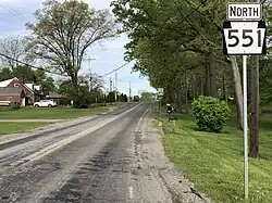 PA 551 enters the borough of Enon Valley in Lawrence County and becomes Main Street, heading into residential areas and crossing Norfolk Southern's Fort Wayne Line. The route intersects PA 351 and becomes concurrent with that route, soon heading north onto State Street as it passes more homes. The road heads into Little Beaver Township and becomes unnamed, heading through more areas of farms, woods, and residences as it passes through Old Enon. PA 351 splits to the northwest and PA 551 continues north on Enon Road, crossing the North Fork Little Beaver Creek again and continuing through more farmland and woodland with a few homes. The road heads into open agricultural areas with occasional residences, passing over I-76 (Pennsylvania Turnpike). The route crosses into North Beaver Township and runs through Newburg, continuing through more rural areas. PA 551 heads through more farmland with some woods and homes as it comes to a junction with PA 108. At this point, PA 108 turns north to form a concurrency with PA 551, with the name changing to Mt. Jackson Road. The road curves northeast through more agricultural areas with some woodland and residences, turning more to the east into wooded areas with some homes. In the community of Mount Jackson, PA 551 splits from PA 108 by heading north along with PA 317 on Mohawk School Road. The road passes farms and homes before PA 551 splits from PA 317 by heading north on Edinburg Road.[2][4]