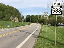 Pennsylvania Route 588 (PA 588) is an east–west state highway in the Western Pennsylvania counties of Beaver and Butler. It travels sixteen miles between PA 51 in Chippewa Township, Beaver County and PA 288 in Zelienople. Other communities through which it passes include the city of Beaver Falls and the borough of Eastvale.