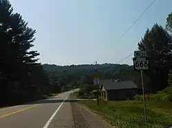 PA 666 was assigned in the mass numbering of state routes in 1928.[3] This routing of PA 666 from Barnes to Nebraska, small municipalities in Forest and Warren Counties. After remaining intact for thirteen years, the highway was extended to Newmansville to terminate at PA 36 and PA 208.[4] This southern extension is now Newmansville Road, three quadrant routes, and two township roads. In 1946, PA 666 was extended westward to East Hickory, with the extension to Newmansville being decommissioned.[5][6]