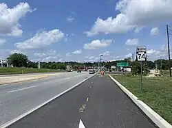 PA 74 forms the border between Windsor Township to the north and the borough of Red Lion to the south before it fully enters Red Lion and becomes East Broadway, passing through residential areas. The road heads past more homes and a few businesses before it reaches the downtown area of Red Lion and comes to an intersection with PA 24. At this intersection, the route turns southwest and becomes West Broadway, heading past residences and curving to the west. PA 74 leaves Red Lion for York Township and gains a center left-turn lane as it passes businesses, turning northwest and becoming East Main Street. The road narrows to two lanes and passes through residential areas as it enters the borough of Dallastown. The route curves west and runs past homes and some businesses, reaching an intersection with the eastern terminus of PA 214. PA 74 passes through the downtown area of Dallastown, with the name changing to West Main Street after crossing Walnut Street. The road passes more homes and turns to the northwest before it leaves Dallastown for York Township and turns to the west, becoming South Queen Street. The route passes fields to the north and residential areas to the south before it runs past businesses. PA 74 makes a turn to the north-northwest and gains a center left-turn lane, heading through more commercial areas and coming to an intersection with the eastern terminus of PA 182. Following this intersection, the road becomes two lanes again and passes through the community of Spry, running north through residential areas with some businesses. Farther north, the route becomes a three-lane road with a center left-turn lane as it passes more suburban development. PA 74 heads past businesses and becomes a four-lane divided highway as it passes west of the York County School of Technology, turning northwest and coming to a partial cloverleaf interchange with I-83.[2][3]