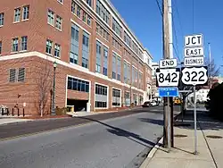 Pennsylvania Route 842 (PA 842) is a state highway in Chester County, Pennsylvania. The route runs from PA 841 in West Marlborough Township to U.S. Route 322 Business (US 322 Bus.) in downtown West Chester. PA 842 runs through rural areas with some development between PA 841 and West Chester as a two-lane undivided road. Along this stretch, the route forms a concurrency with PA 82 in Unionville, where it intersects the western terminus of PA 162. In West Chester, PA 842 is routed along one-way streets. PA 842 was first designated by 1928 between PA 82 in Unionville and US 122/PA 5/PA 62 in West Chester. The route was extended west to PA 841 in 1937.