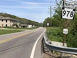 PA 978 begins at a signalized intersection with PA 50. It heads north and crosses a Wheeling and Lake Erie Railway line at an at-grade crossing. Shortly after this, PA 978 curves northeast paralleling the railroad and Millers Run. The road then turns north after intersecting Millers Run Road.