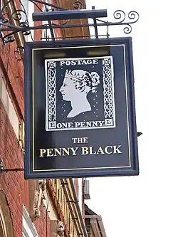 The pub sign of the Penny Black, formerly a post office, in Oxfordshire