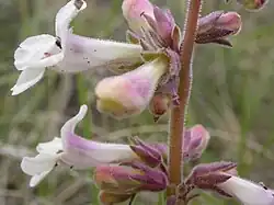 Penstemon albidus, commonly known as white penstemon,[3] white-flower beardtongue,[4] or Red-Line Beardtongue[5] is a very widespread perennial flower of the mixed-grass and shortgrass prairies.[4] Its natural distribution is from Manitoba and Alberta in Canada to Texas and New Mexico in the United States.[6] The bright white flowers for which they are named are quite attractive to both bees[7] and hummingbird moths.[8][9]
