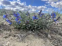 The species name, arenicola, means growing in sand in botanical Latin.[3] It has the common name Red Desert penstemon for the Red Desert region of Wyoming where it is found.[4] It is also sometimes known as sand penstemon,[7] however other species including Penstemon acuminatus and very commonly Penstemon ambiguus are also called this.[8][9]