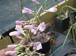 The species name, comarrhenus, is a compound of the words for hair and male, referring to very hairy anthers.[3] In English it is known by the common names dusty penstemon or dusty beardtongue.[5][3]