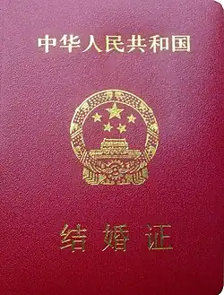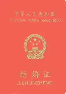 The People's Republic of China Marriage Certificate (Chinese: 中华人民共和国结婚证) is a legal document issued by the Chinese Marriage Registration Authority to prove the valid establishment of a marriage. Two marriage certificates are issued for both parties of the marriage.[1]