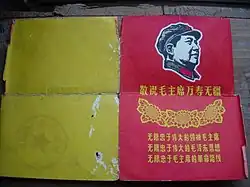 After the promulgation of the "Marriage Registration Measures" in 1955, marriage certificates were printed by county and municipal governments independently, their forms and specifications varied greatly, lacking a unified standard, and most adopted the style of a certificate of merit. From the 1950s to the 1970s, the decorative patterns on marriage certificates included traditional auspicious patterns such as mandarin ducks playing in the water and plum blossoms, as well as new patterns such as rice ears, cotton, and doves of peace. Slogans are often printed on marriage certificates, such as "Marriage is voluntary" in the 1950s, "diligence and thrift, family planning" in the 1970s and 1980s. During the Cultural Revolution, they frequently featured Chairman Mao's portrait or quotations.[5][6]