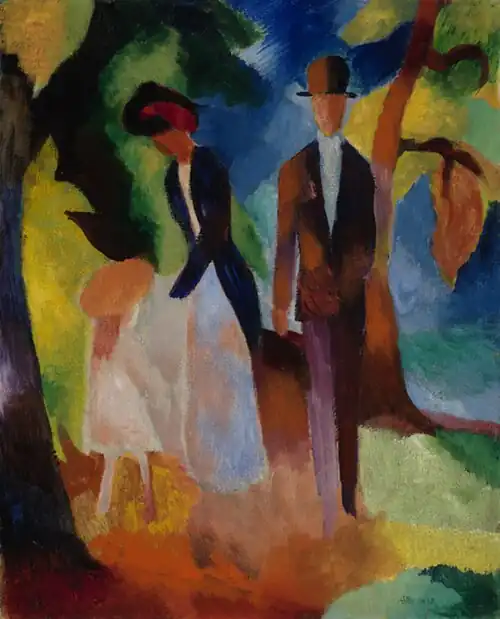 This painting was probably started and finished in Hilterfingen. The painting depicts, from right to left, three people, a man and a woman, presumably a couple, with the woman talking to her daughter. Behind the man, a tree is seen, while another one is partially seen at the right. In this work, Macke expands the boundaries of the influence of impressionism and fauvism on his own work, going in his quest further, seeking the highest expression of his understanding of the meaning of color in painting. The main colors of the painting are those obtained during the decomposition of white light: red, orange, yellow, green, blue and violet. Freely, without sharp boundaries, they pass one into another, uniting in a kind of color circle with twelve sectors. Macke embodies in the painting, which shows the mutual influence of one color on another, their harmonious and disharmonious combinations, the laws of the color circle.[1]