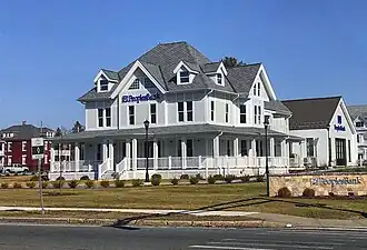 PeoplesBank is a branch bank incorporated on March 19, 1885 as Peoples Savings Bank. Its first president was William Skinner of William Skinner and Sons Silk, who would serve as the bank's president from its founding until 1901, a year before his passing. A number of prominent figures in Holyoke's founding would work for the bank, including architect George P. B. Alderman, who sat on its board, and Judge John Hildreth, as a clerk, whose Oakdale estate, the Yankee Pedlar, was reopened as a branch of the bank in 2019.[2][3][4] It was first headquartered in Downtown Holyoke, Massachusetts with an additional office in Springfield, Massachusetts. In 1974, the bank would expand its headquarters with a large Brutalist commercial block at the corners of High and Suffolk Streets as part of a city revitalization campaign, where it maintains a branch today.[5]