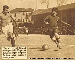 Pepe made his international debut for Portugal at the age of 19, in a friendly against France played in Lisbon on 16 March 1927. Pepe scored two goals in his national side's 4–0 victory. In total, he played 14 games for the Portugal national team, scoring 7 goals. Pépe also played for Portugal at the 1928 Olympic Games football tournament in Amsterdam.[1] Portugal defeated Chile (4–2) and Yugoslavia (2–1), but subsequently lost to Egypt (1–2) in the quarter-finals. Egypt later lost to Argentina in the semi-finals and to Italy in the match for the bronze medal. Pepe's last appearance for Portugal was in Porto on 23 February 1930, a 2–0 win over France.