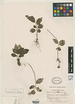 It is an impoverished terrestrial herb that is somewhat grassy, with a somewhat curly-pubescent stem and alternating subovate-elliptic and subacute leaves on both sides. 2.5–5 centimetres long, 1.5–2.5 centimetres wide, 5-veined in vivo; round-peltate plates, thin spikes 60 millimetres long laden with small pseudopedicels, white veins, pink beneath; petiole 5 millimetres long.[4]