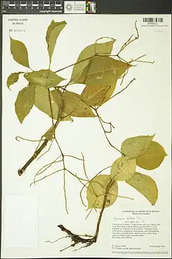 The leaves are long-petiolate, elliptic-lanceolate, pointed at the apex, and glabrous on both sides. The central nerve, which extends to the apex at two thirds of its length, sends alternate ascending nerves 7–8 on both sides. The common tip of the terminal peduncle is ternate, and its leaves are orbicular and ovary, emerging to half of their height above the stigmatic base.[4]