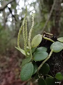 When held up to the light, the midrib and lateral veins, as well as the anastomosing connecting veinlets, are clearly apparent; the petiole is between 1/2 and 3/4 inches long. The leaf is oblong at the apex, cuneate in the lower half, and membranous in texture. It is dark green and pubescent on both surfaces. On short, slender peduncles that grow to be 3–4 inches long, spikes are generated from the axils of the leaves. The stigma is sessile and globose, and the ovary is ascending and glabrous, inserted into the sulcate rhachis' grooves.[5]