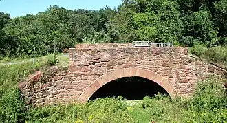 The Pequabuck Bridge is located in central southern Farmington, and is set just north of the modern Meadow Road crossing of the Pequabuck River, a tributary of the Farmington River. It now crosses over an occasionally wet channel that the river formerly occupied; the river was rerouted to the east with the construction of the modern road bridge. This bridge has a single stone arch, with a span of 22 feet (6.7 m) and a height of 11 feet (3.4 m). It is built mainly out of brownstone rubble, which is the major element of its abutments, spandrels, wing walls, and parapets. The arch itself is shaped out of finished brownstone voussoirs. The bridge is about 20 feet (6.1 m) wide, and its arch is topped by earth fill[2] and a paved surface that now carries pedestrian and bicycle traffic.