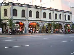 With its historic colonnaded covered walkways, Peranakan Place is currently an attraction on Orchard Road for tourists and locals alike.[6] It is closed off to traffic, and has commercial spaces as well as food and beverage outlets. Peranakan Place as it stands today is a commercial development that holds businesses ranging from F&B to retail. As the front faces the main shopping district of Orchard Road, the historic building receives a higher volume of traffic as compared to the quieter housing areas further in on Emerald Hill Road. The owners and tenants are thus required to abide by strict conservation standards set by the URA to ensure that the integrity of the building is preserved.[7] The display of a Chinese Baroque style of architecture, which uses a mélange of Chinese and European influences, can still be seen from the colourful yet structured façade.