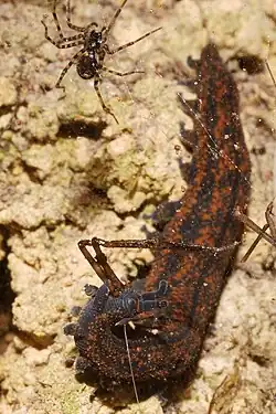 Peripatids use their oral papillae to shoot out sticky slime which thickens upon contact with the air and covers prey in a strong, net-like structure.[6][14] They approach and use their jaws to puncture the cuticle of the trapped animal, injecting digestive enzymes and sucking up the liquefied remains.[6][14][7]