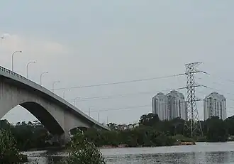Permas Jaya Bridge or Jambatan Permas Jaya (Jawi: جمبتن ڤرمس جاي) is a river bridge in arch shape in Plentong, Johor Bahru District, Johor, Malaysia. The bridge crosses Tebrau River and Plentong River. The bridge is built to shorten the travel distance between Bandar Baru Permas Jaya to Johor bahru city area from 18 km (estimated) to 6 km (estimated).[1] The bridge was once the longest Arch bridge in Southeast Asia in 1994, which is about 1.5 km long.