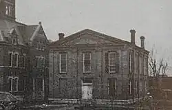 In the early days before statehood, court sessions took place in private homes or the parish houses. By 1821, the population of the Barrens and surrounding area warranted the separation of the southeastern portion of Ste. Genevieve County into a new county, Perry County. After Perry County was organized in 1821, the county court was established on May 21, 1821 in the home of Bede Moore, located two and half miles north of Perryville, by Lewis Cissell, D.L. Caldwell, and Samuel Anderson. County officials used a two-story log building for conducting county business. At first, there was a delay in building a court house as the population of Perry County had also been obliged to help fund the courthouse in Ste. Genevieve County, as they had been a part of that county. Commissioners were appointed to locate a seat of justice somewhere in the county, but no move was made toward the erection of a courthouse until 1825.[3] Because of its centrality, population, and location on the historic road between Ste. Genevieve and Cape Girardeau, the area just east of the Barrens was chosen to be the seat of Perry County. Bernard Layton donated fifty-one acres of his land one-half miles east of St. Mary's Seminary for the site of a county-seat town, Perryville.[4]