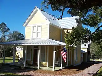 It was built in 1887 by Perry L. Biddle, who settled in DeFuniak Springs about 1886. The house is a large symmetrical design that displays a cross gable roof with a simple frieze that encircles the building. The original, two-story primary unit has the shape of a MT," and a roof covered with tin standing seam panels, which appear to have replaced the original pressed-metal shingles.